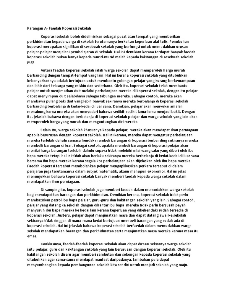 Izharnya koperasi sekolah mustahak dalam memupuk nilai-nilai murni pada diri pelajar dan semua warga sekolah. Karangan Bahagian A SPM Koperasi by Kamariah_Maria_2835. Setiap sekolah mempunyai koperasi yang tersendiri.
