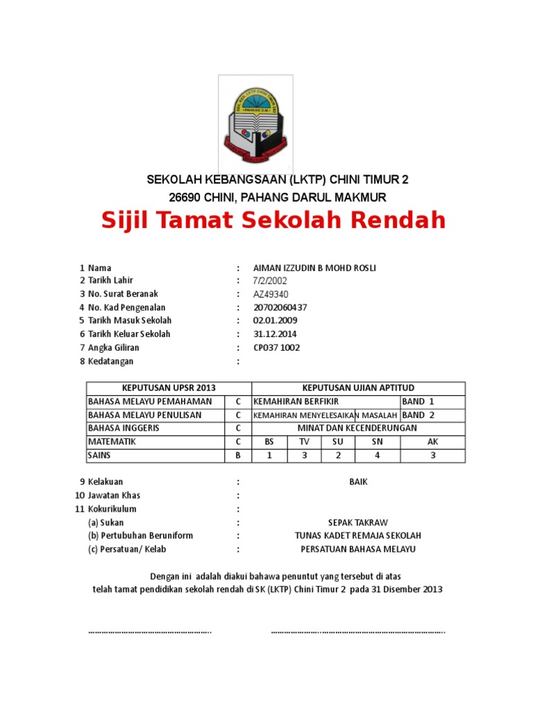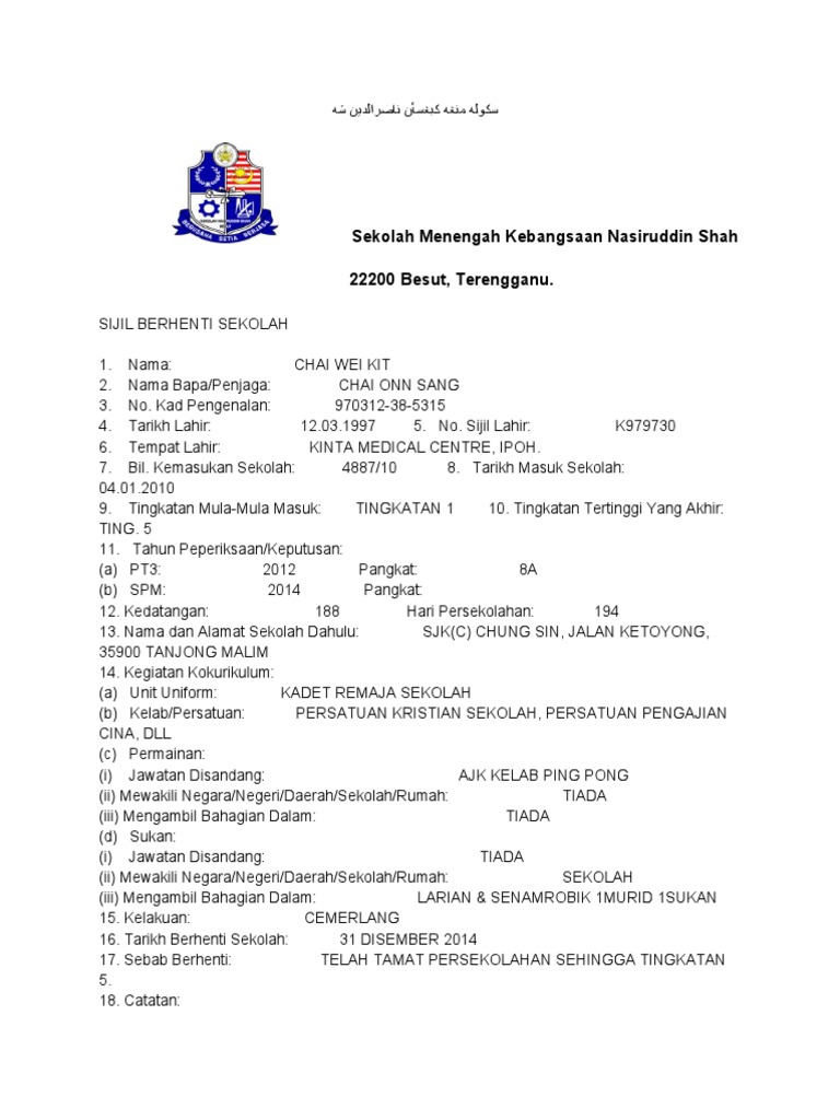 Sekolah kebangsaan jeram no. 09-7521127 sijil berhenti sekolah 1. Telah tamat persekolahan sehingga tingkatan 5.